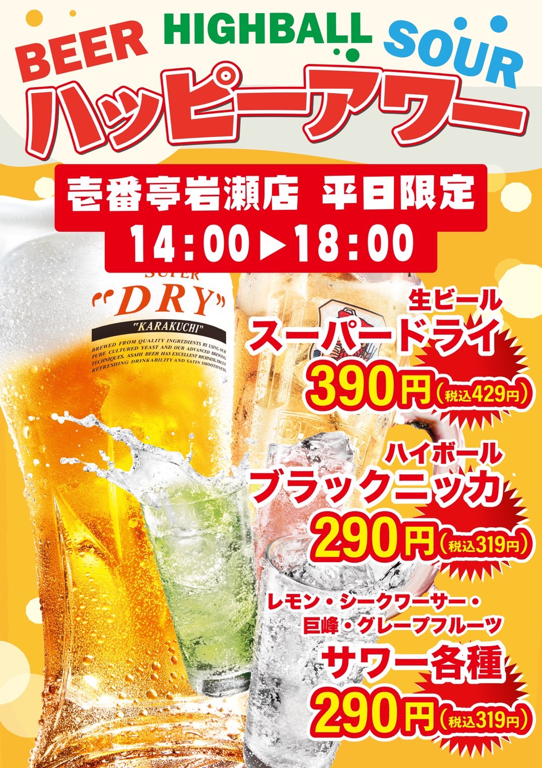 【壱番亭岩瀬店・壱番亭下館店】『ハッピーアワー』実施中♪14時~18時はオトクにほろ酔い♪