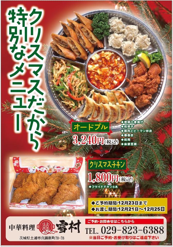 【中華料理雪村】 クリスマスオードブル・チキン予約開始♪