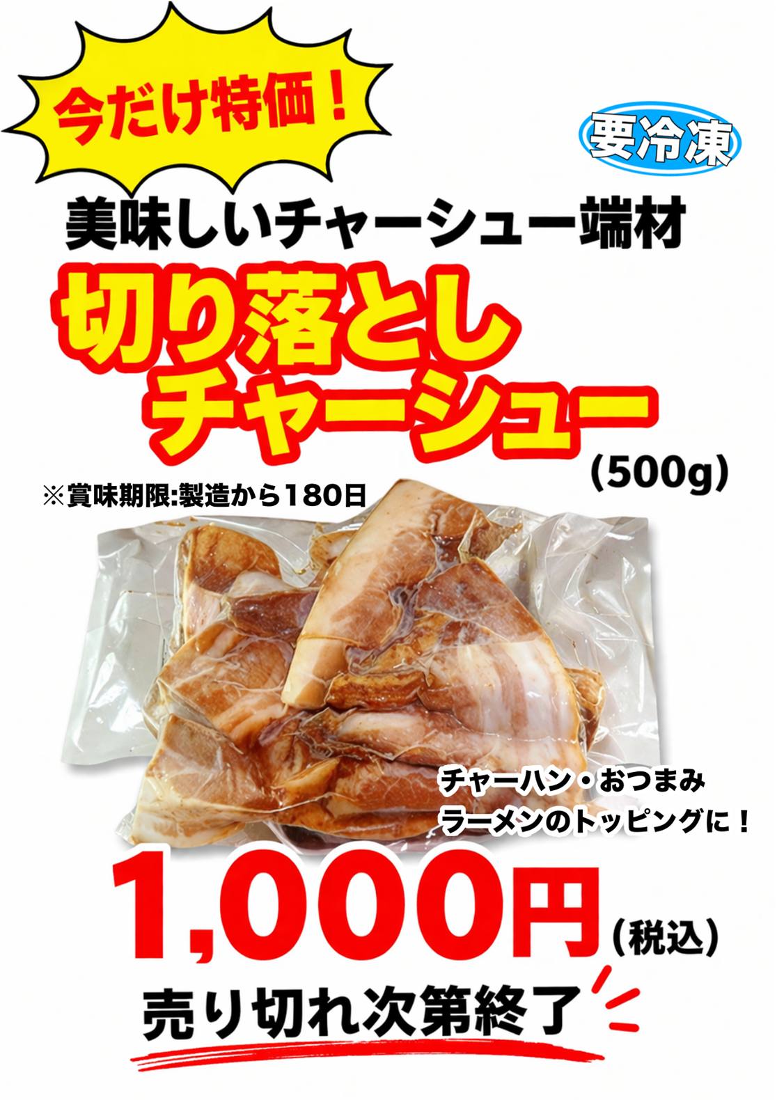 【商品】『特価!切り落としチャーシュー(500g/袋)』¥1,000 《冷凍保存》